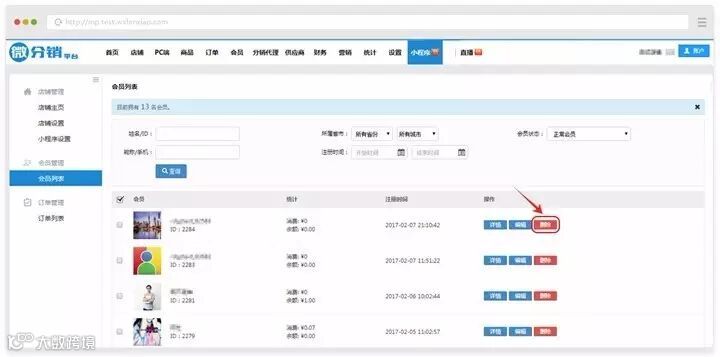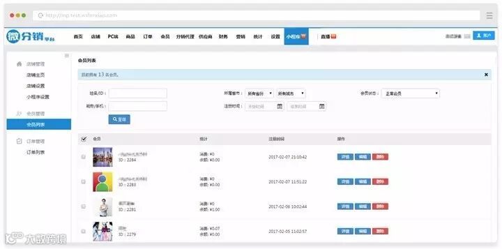 2) 列表项:会员、统计、注册时间和操作
