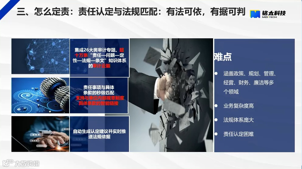 经济责任具有业务复杂度高、法规体系庞大、责任认定困难等特点。“小铭铭”集成26大类审计专题,构建起超十万条从“责任到问题,到定性、到法规依据”,审计中对发现的问题,审计人员只要输入问题的关键词或输入问题的描述,小铭铭就能秒级匹配审计问题定性,及相应的法律法规的具体条款,在内部审计中,对问题定性、责任认定不仅需要国家法律法规,更需要单位内部的规章制度,小铭铭突破性支持与单位内部规章制度具体条款的智能匹配,小铭铭深度融合国家法规与行业规范及单位内部规章制度具体条款的智能匹配,建立起一个高效精准的审计知识云脑。让服务单位口服心服。
