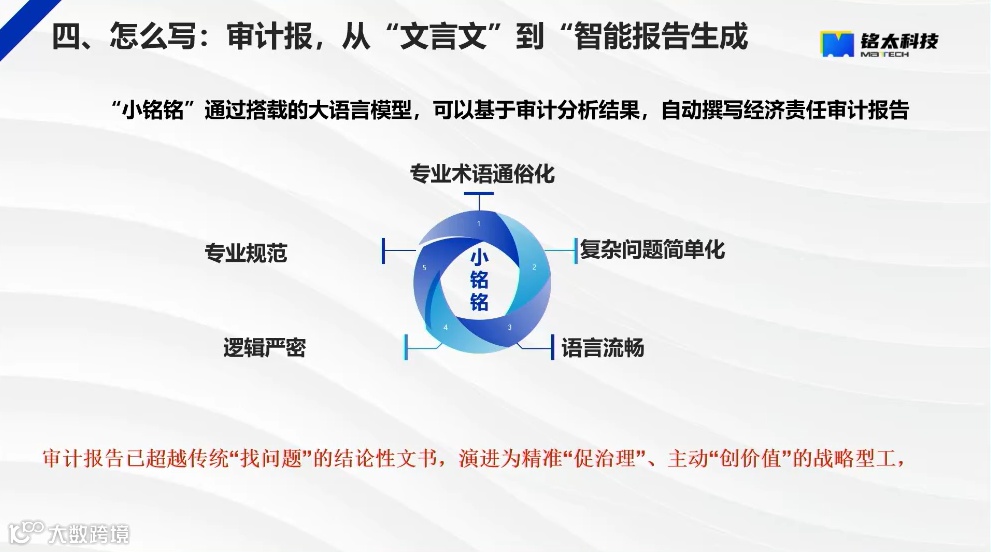 小铭铭通过搭载的大语言模型,可以基于审计分析结果,自动撰写”专业术语通俗化,复杂问题简单化“、且语言流畅、逻辑严密、专业规范的经济责任审计报告。至此,审计报告已超越传统“找问题”的结论性文书,演进为精准“促治理”、主动“创价值”的战略型工具,