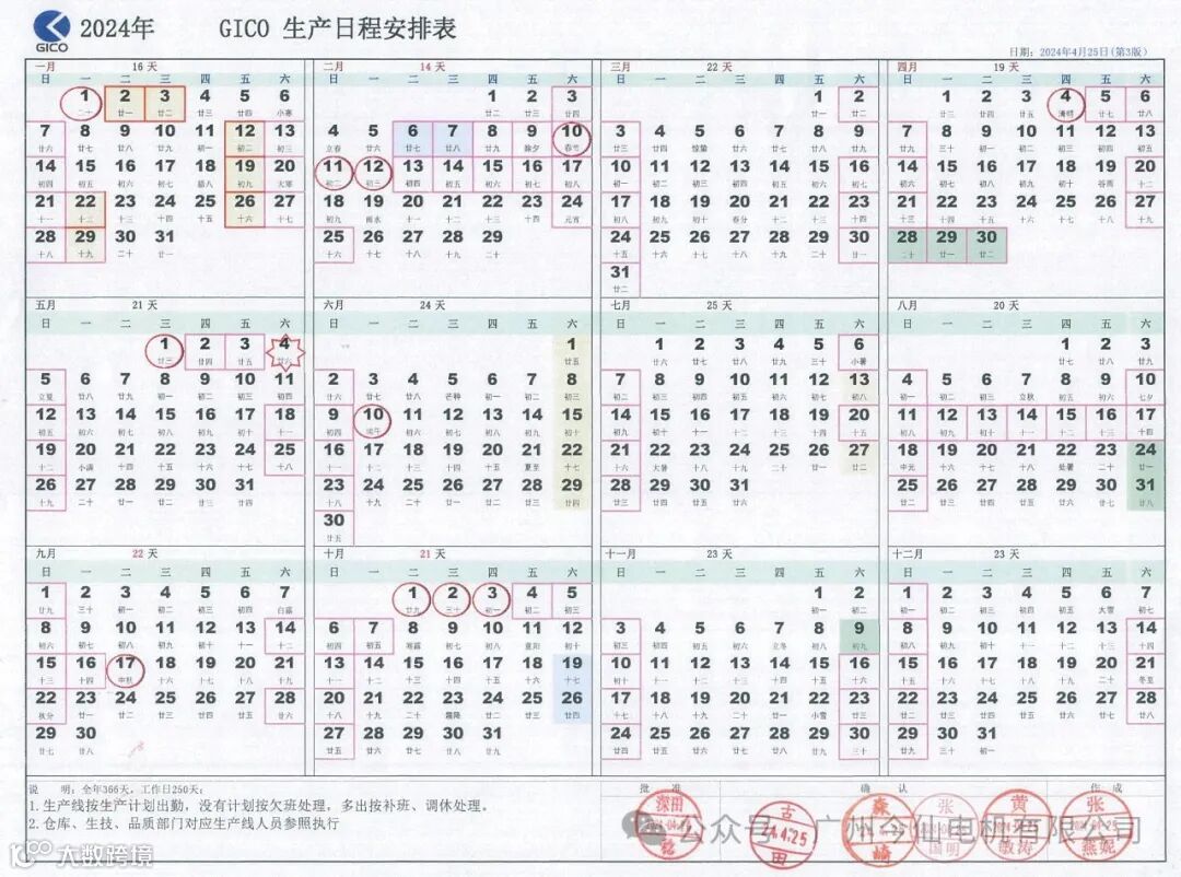 导读:全年366天,工作日250天1、 生产线按生产计划出勤,没有计划按欠班处理,多出按补班,调休处理。2、 仓库,生技,品质部门对应生产线人员参照执行
