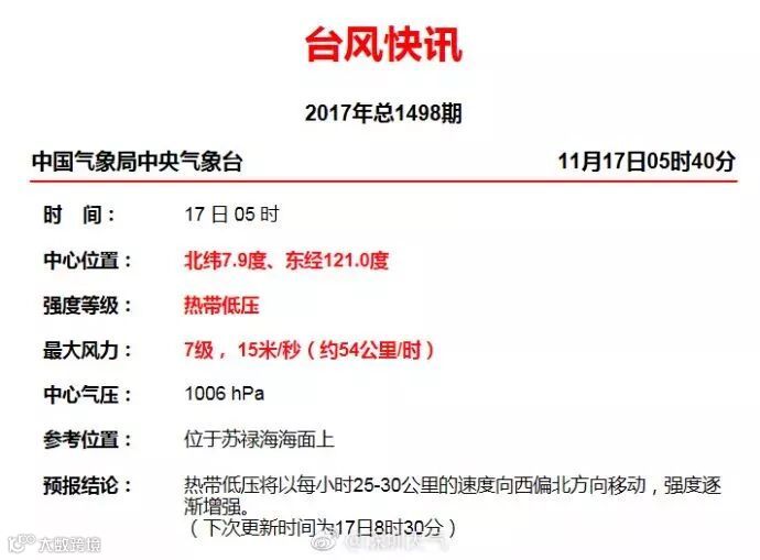 目前最新热带低压(台风胚胎)位于菲律宾附近海面,预计该热带低压将以25km/h左右的速度向西偏北移动,将于今天傍晚前后进入我国南海,并可能于夜间发展为第25号台风“鸿雁”,尔后逐渐趋向越南南部。虽然此热带低压会被冷空气压制,对我们无影响,但仍需警惕它与冷空气联手造成的南海海面大风。