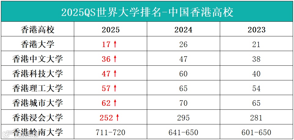 香港理工大学,香港城市大学和香港浸会大学也都在稳步上升中,分别排名第57,第62和第252;岭南大学的排名是7所中唯一下滑的,排在全球第711-720。