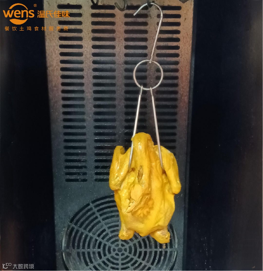 拆封真空内包装后用铁钩沿盐焗鸡鸡翼下勾紧待挂置。