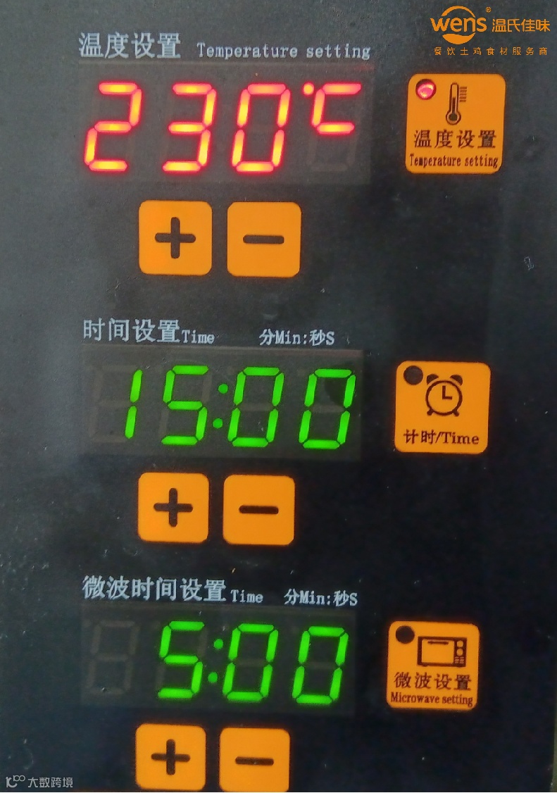 设置烤箱温度为230°C,预热烤箱温度,待箱内温度到达230°C时将勾置好的盐焗鸡挂置于烤箱内部。烤制时间设置为15min,微波时间设置为5min,关上烤箱门等待即可。