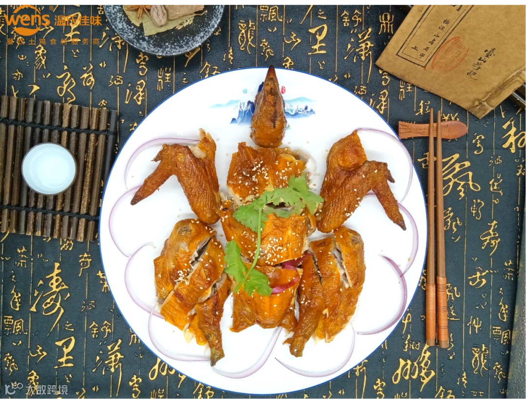 沿脊骨与胸骨中间横向剖开整鸡,分别切成均匀的小块,随后同切块鸡翅与鸡腿摆好成盘。