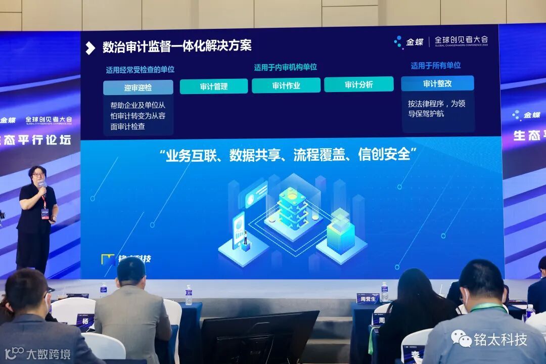 铭太科技董事长柳絮在论坛上分享了审计领域的 “数治”创见与实践。大会上,金蝶和铭太科技联合发布了数治审计监督一体化解决方案,构建“业务互联、数据共享、流程覆盖、信创安全”的全面审计监督体系,以“科技强审”赋能用户数治化建设,共建信任生态新思路、新局面。