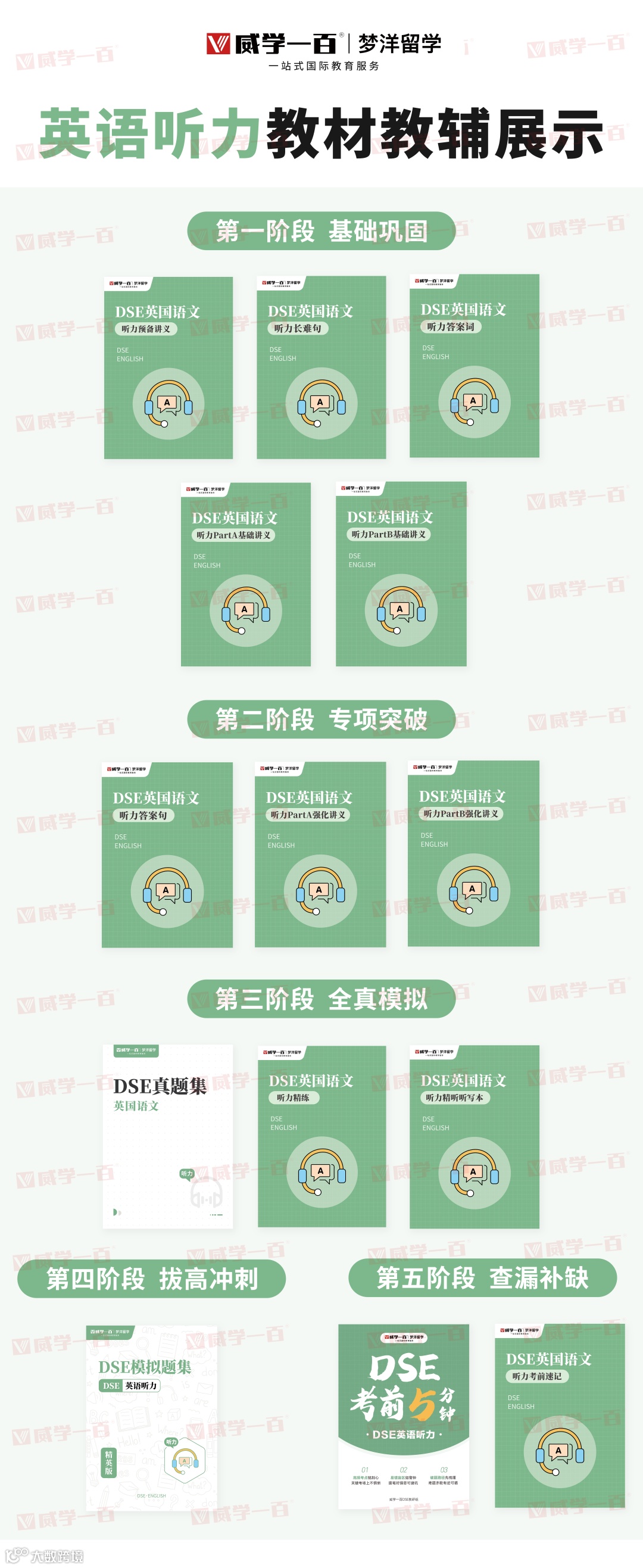 使用《DSE听力预备讲义》《DSE听力长难句》《DSE听力Part A基础讲义》《DSE听力Part B基础讲义》四本教材,纠正发音误区,提升语音辨识能力,训练长难句听力理解能力,系统梳理听力核心知识点,熟悉Part A、Part B基础题型特征与考点,搭建完整听力知识体系。同时,配套使用《DSE听力答案词》,同步积累听力高频答案词,强化词汇记忆与听力对应能力。