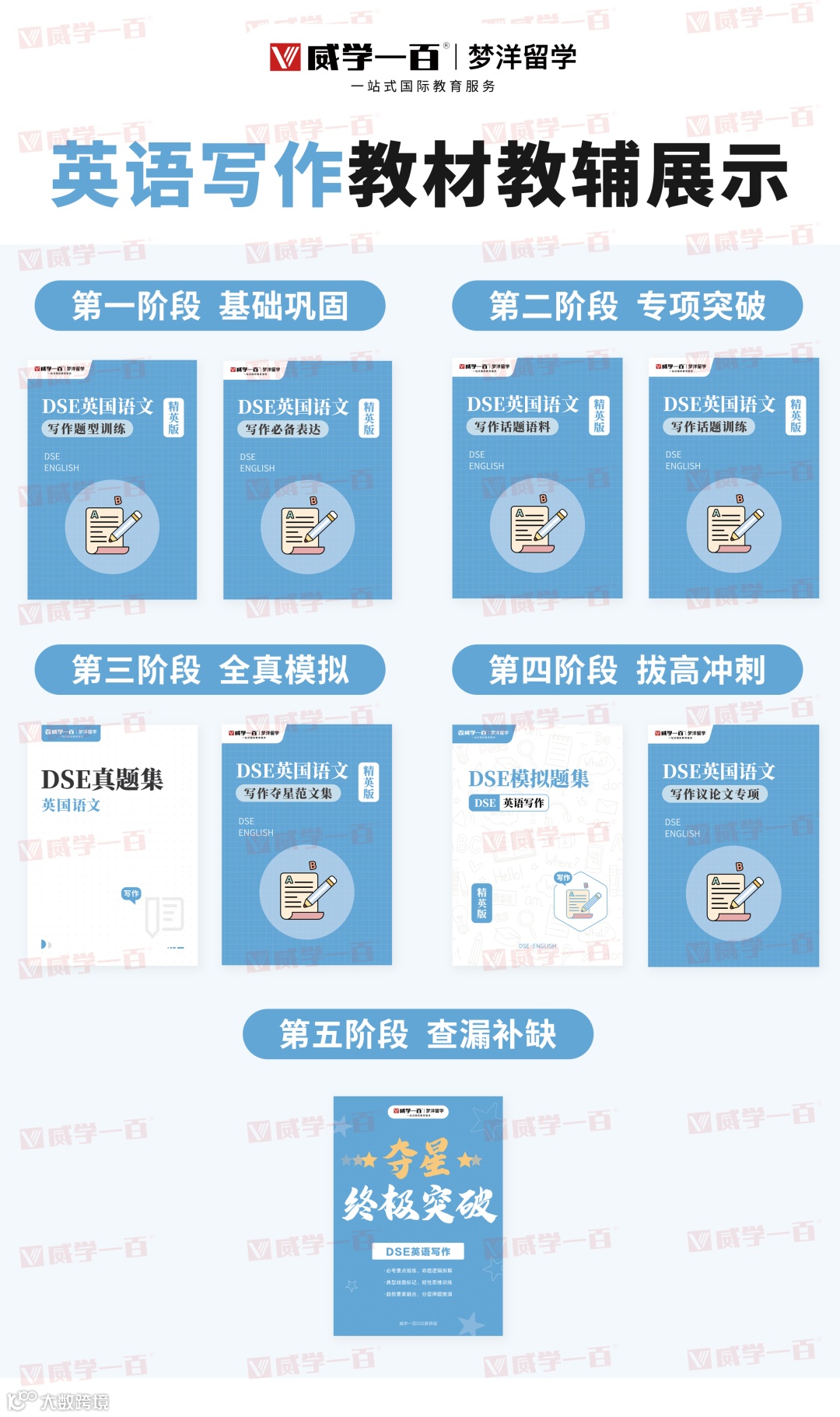 这一阶段,学员将使用《DSE英语写作模拟集》开展高强度仿真考场限时写作训练,熟悉多样文体与话题的写作思路,同时配套使用《DSE英语写作议论文专项》,重点强化议论文写作能力,解决限时写作中审题、构思、文字输出的核心问题,提升写作综合应试能力。