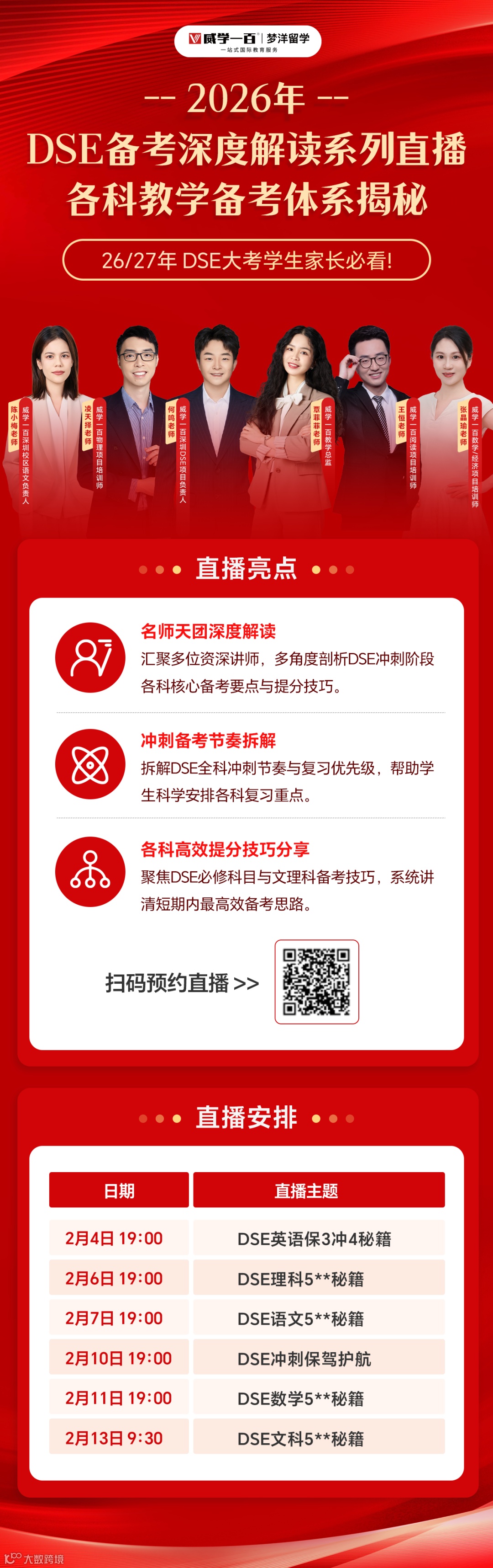 时光迈入2月,2026年DSE大考进入最后的冲刺阶段!此刻的每一分努力都关乎最终战绩,如何精准发力、高效突破各科瓶颈,向着高分全力冲刺?威学一百重磅推出「26年DSE备考深度解读系列直播」,从2月4日起,共6场干货专场,聚焦必修+选修科目提分策略,为各位考生的备考之路保驾护航!