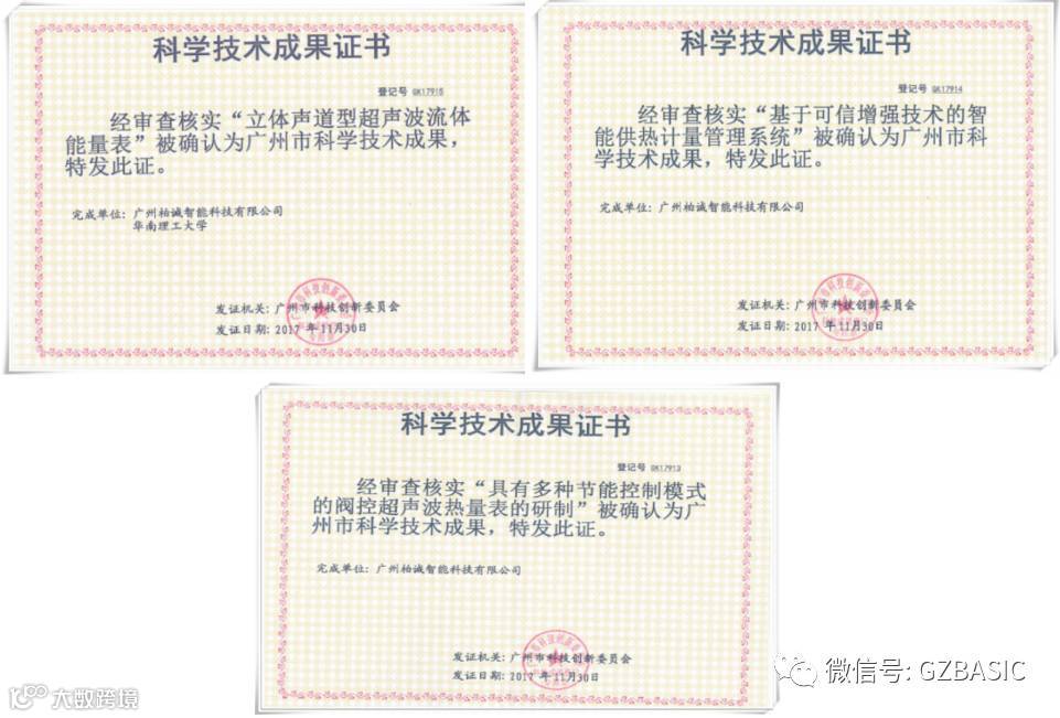 近日,广州柏诚智能科技有限公司独立研发的“具有多种节能控制模式的阀控超声波热量表的研制”、“基于可信增强技术的智能供热计量管理系统”及与华南理工大学共同研发的“立体声道型超声波流体能量表”3项成果经广州市科技创新委员会审查核实,被确认为科学技术成果,并颁发了《科学技术成果证书》。