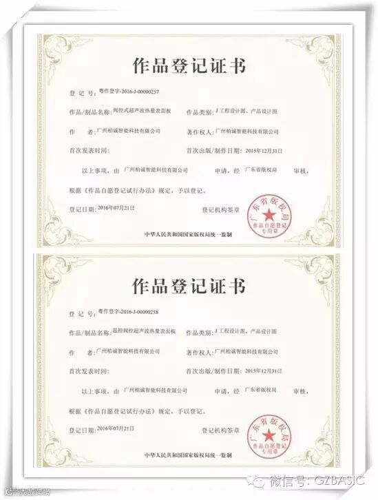 近日,我公司“阀控式超声波热量表面板”和“温控阀控超声波热量表面板”分别获得了广东省版权局认定的作品登记证书。