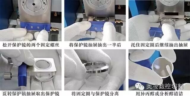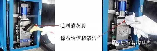 每天上下班先用毛刷清灰尘,再用白色干净不脱毛的棉布沾少量酒精清洁整个切割头外表(请注意不能用气吹)。