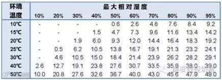 因为结露而产生的故障,不属于正常的保修范畴。通常情况下,结露对激光器的影响是需要一定过程的。内部结露的前期都会有一些容易发现的征兆,比如,外部裸露 的冷却水管表面通常会先出现结露,一段时间后才会蔓延至激光器内部。具体的露点与环境温湿度直接的对照关系,可参见下表: