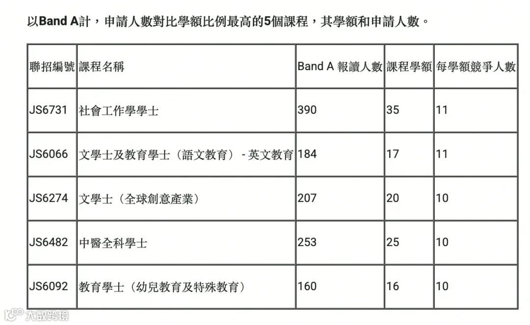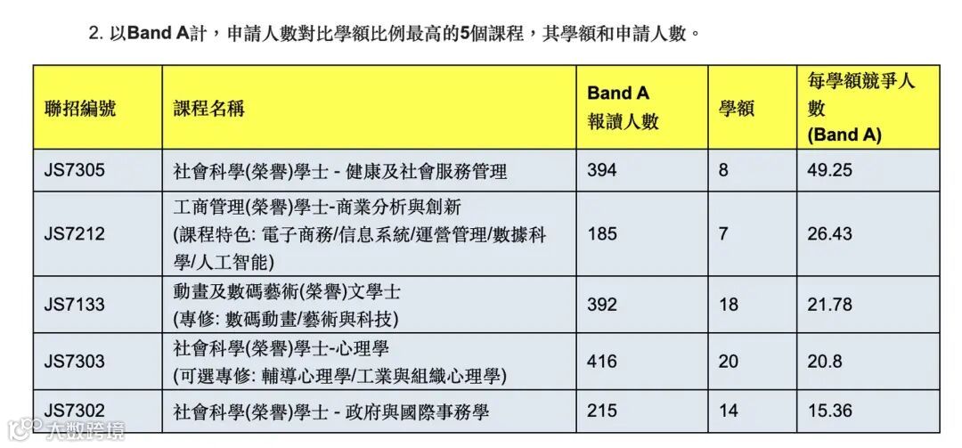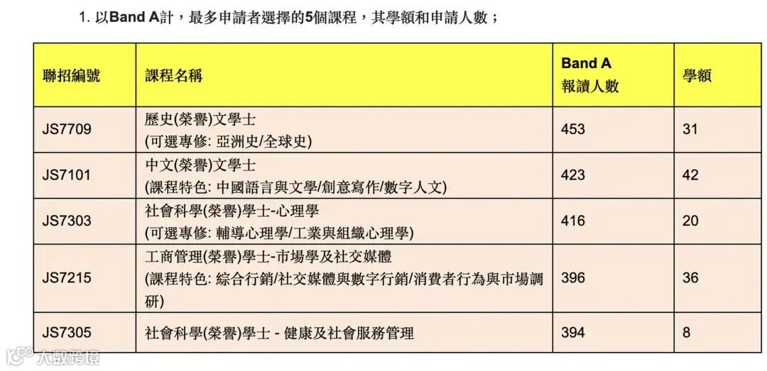 历史文学士最多学生报读,共453人申请;竞争最激烈课程为社会科学学士(健康及社会服务管理),394人争夺8个学额,平均约49人争一席,是8间大学中竞争最激烈的课程。