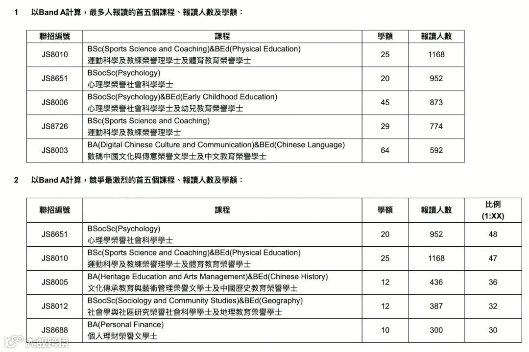 最多学生报读运动科学及教练理学士及体育教育学士,共1,168人;竞争最激烈的课程是心理学,952人争20个学额,平均约48人竞争。