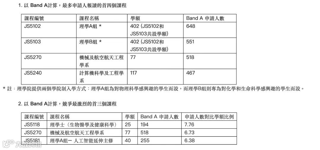 理学A组(专为对物理科学感兴趣的学生而设)最多人报读,有648人;竞争最激烈的为理学士(生物医学及健康科学),194人争25个学额,平均约8人抢一个学额。