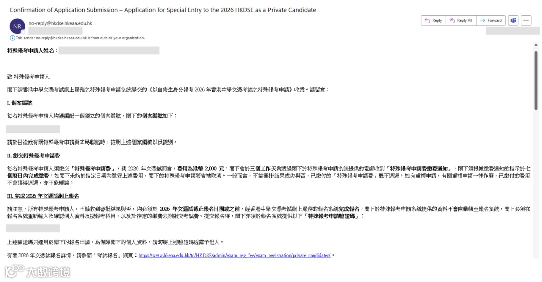 提交报名时,须于报名系统输入上述确认递交特殊报考申请的邮件内所提供之「特殊报考申请验证码」。上述验证码只用于报名申请,为保障你的个人资料,请勿将验证码透露予他人。
