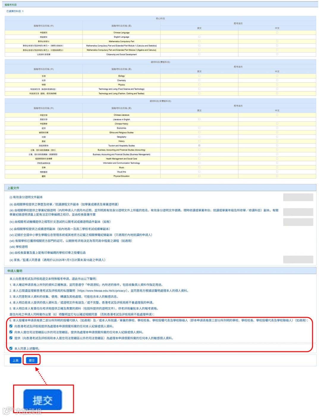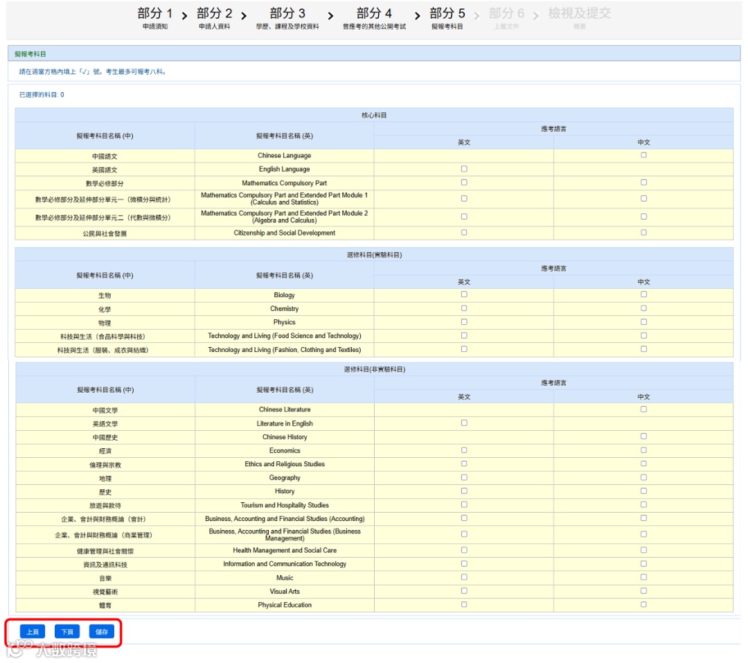 在版面选择拟报考的文凭试科目,每位考生最多可报八科。自修生所报考之科目可从甲类或丙类两个学科任何类别中挑选,但网上特殊报考申请系统只处理文凭试甲类科目之特殊报考申请。