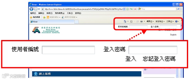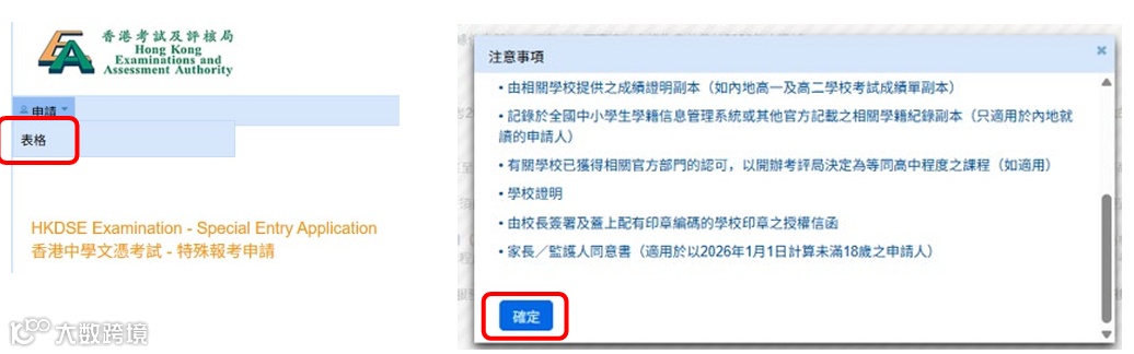 登入网址:www.hkdse.hkeaa.edu.hk,输入使用者编号及密码登入系统,点击上方【特殊报考申请】,申请系统会在新视窗开启。