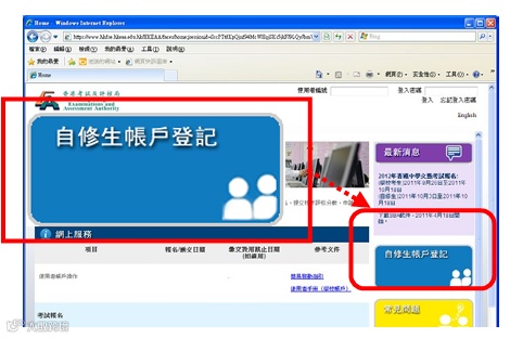 步骤1:登入网址www.hkdse.hkeaa.edu.hk,点击右方【自修生账户登记】。