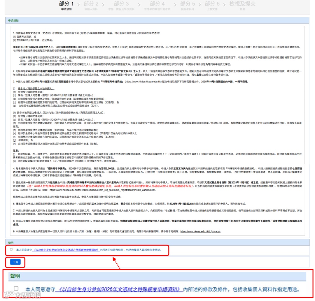 步骤2:阅读申请须知,勾选声明表示同意条款及个人资料用途