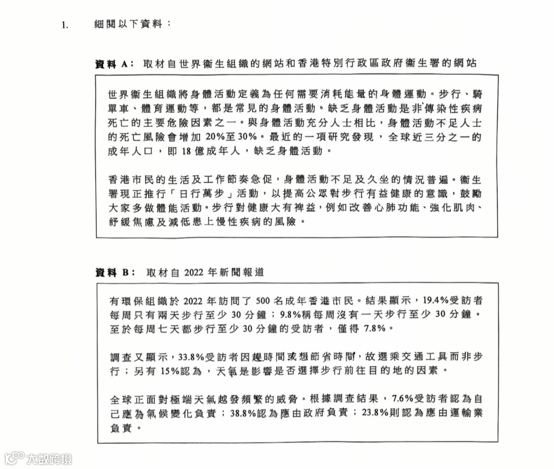 第一题:考察香港市民身体健康、低碳出行、公共卫生