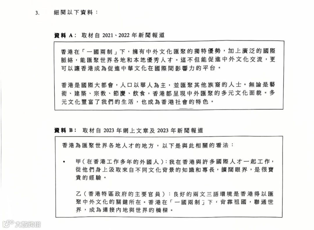 此外还考察了香港中外文化汇聚的特色,要求考生指出香港具备哪些优势有助于弘扬中华文化,并结合实例说明。