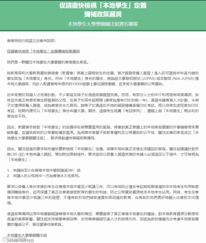 有家长投诉指,通过高才通等港府抢人才计划在短期内取得香港身份,以“本地学生”身份后升读港八大对其他学生不公平,要求政府尽快重新检视本地学生定义。