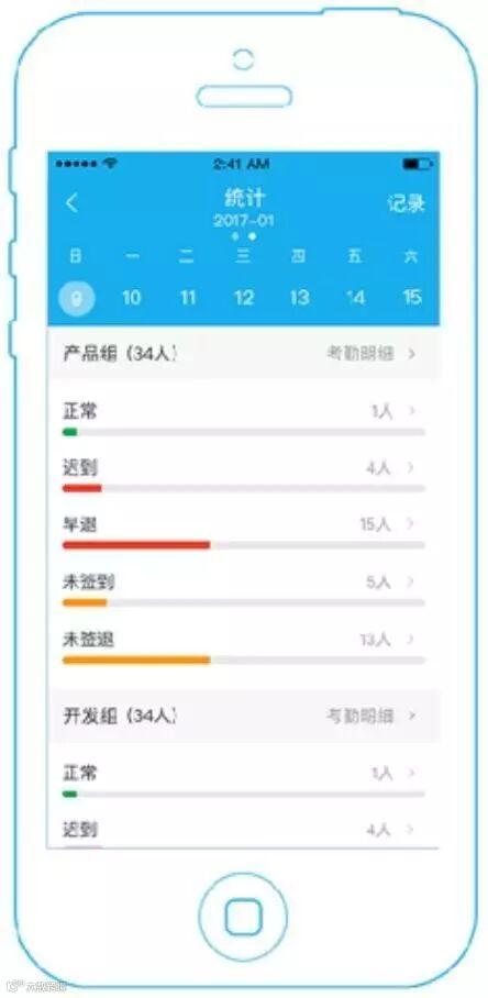• 默认查看当天的考勤统计,右滑查看历史考勤统计。