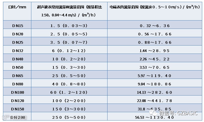 表1 超声波表和电磁表的流量特性对比(DN15~DN200)