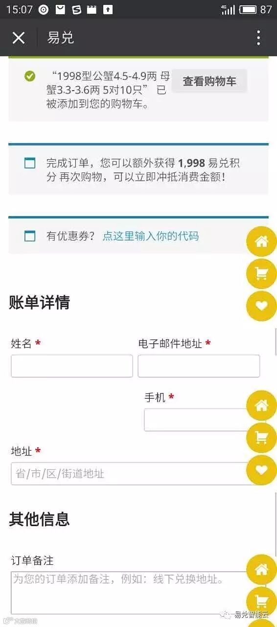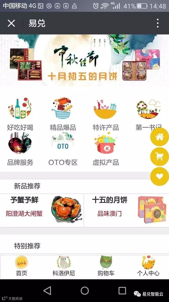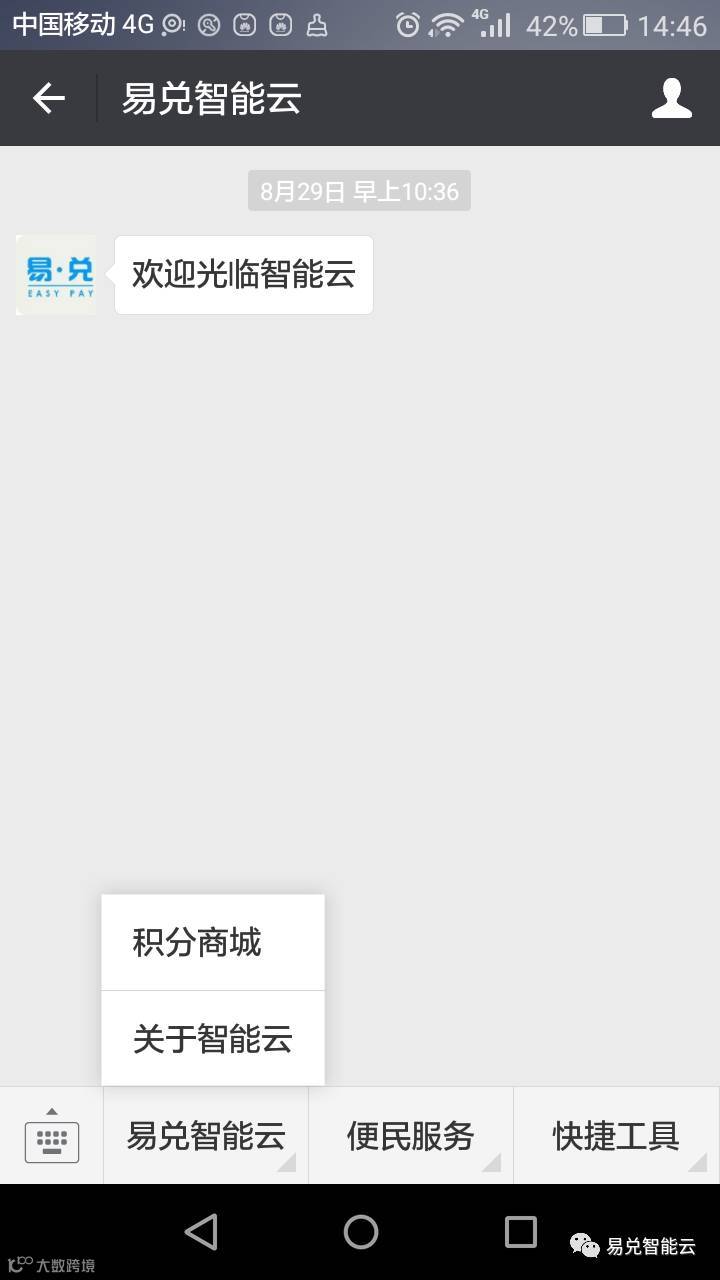 2、进入公众号页面,点击“易兑智能云”——“积分商城”