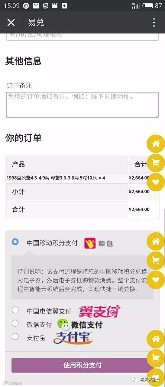 3、填写信息完毕之后,可以选择中国移动积分支付、中国电信翼支付、微信支付、支付宝,以上方式下单