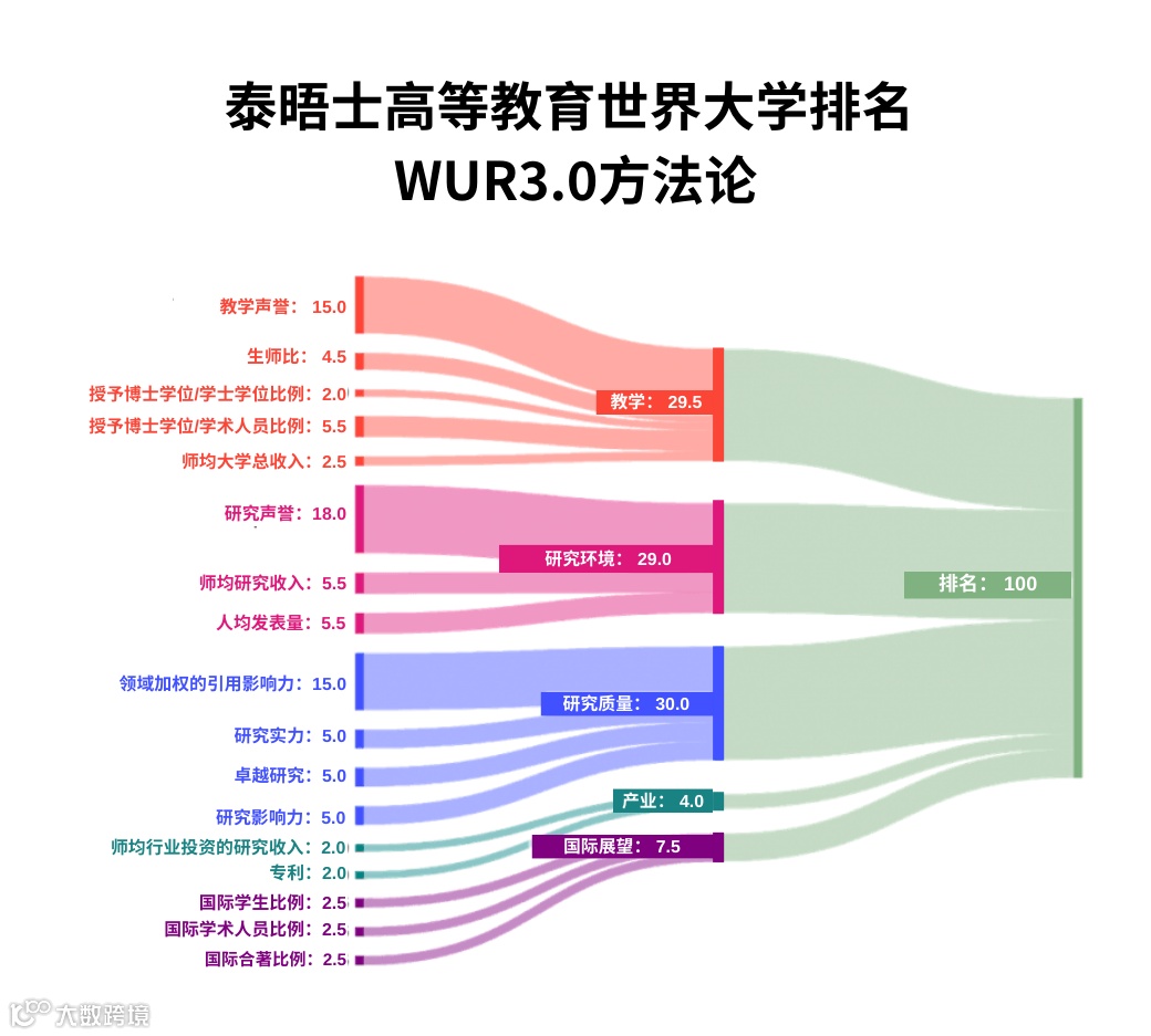 根据图中数据,可以看出THE的考量偏重教学和研究影响力,几乎都是在考察教学、科研和论文。如果有同学未来有志于走学术路线,想在学术上长期发展,那么这份榜单将是不错的参考。