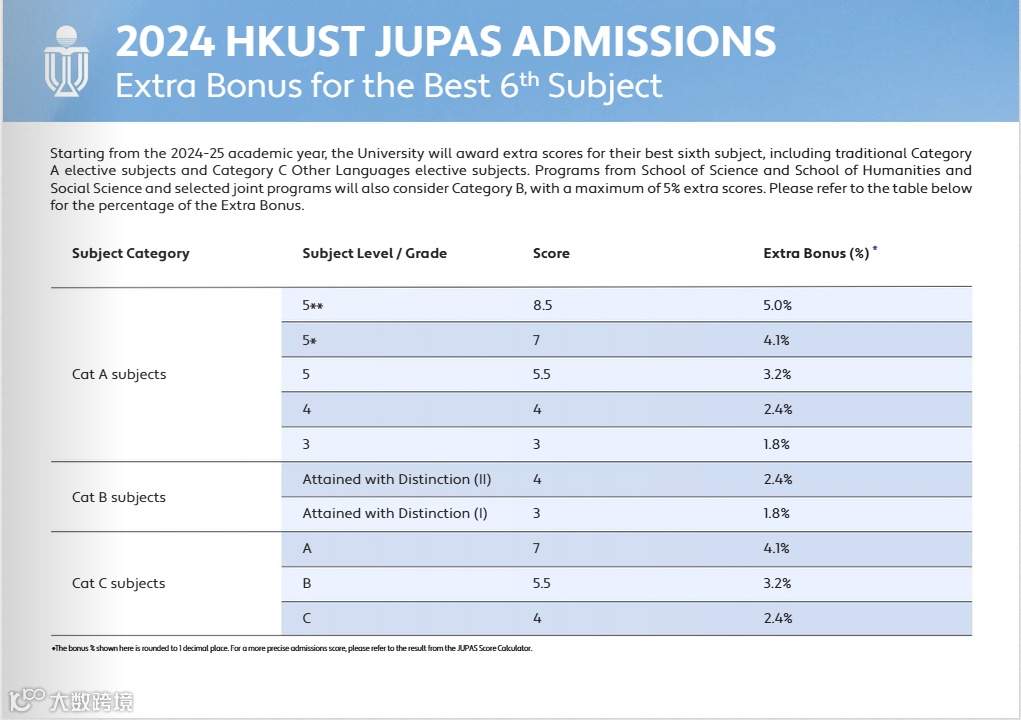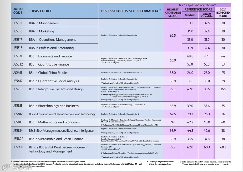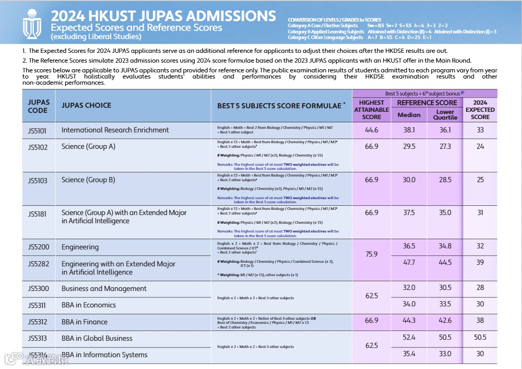 2024年港科大的课程通常采用英+数+Best3的计分方式,且有的专业对数学和英文会有额外的分数加权。