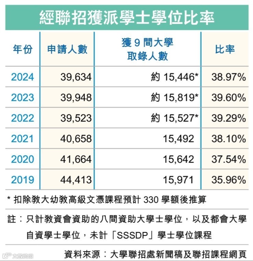 另有4,392人(11.08%)获派「指定专业/界别课程资助计划」(SSSDP)资助自资学士学位课程,人数较往年多700人。两个累别合共有2万人获得派位,当中约八成获派首三志愿(Band A)课程。