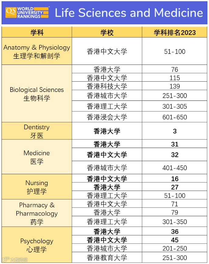 在今年的QS世界大学学科排名中,香港地区的高校在生命科学与医学(Life Sciences & Medicine)专业方面,整体表现不俗,实力强劲!