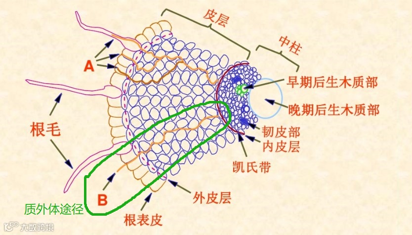 根系外的养分从根表皮细胞进入根内,经过平层组织到达中柱的迁移过程叫短距离运输,又叫横向运输,即根外养分转移到根部相邻细胞。