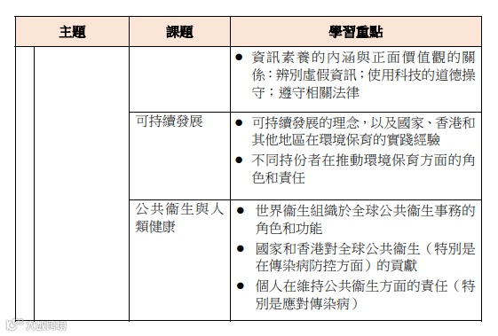 公民与社会发展科旨在让学生通过学习关于香港、国家及当代世界的课题,建立广阔的知识基础,培养学生国民身分认同,以及具备世界视野,并能从研习经济、 科学、科技、环保、可持续发展等范畴的不同课题。