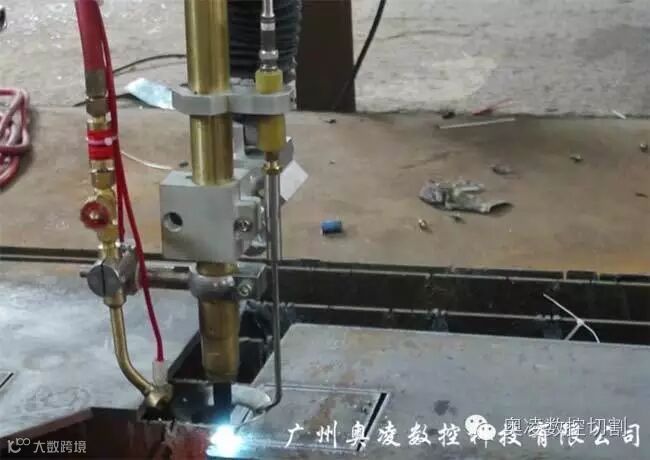 数控火焰切割机切割圆规的构造很简单,就是按照割嘴外套的外经做一个厚度3mm、长度13~16mm的套管,在套管的中间焊上一根直径5~6mm、长度300mm左右的移动锥形定位杆即可。