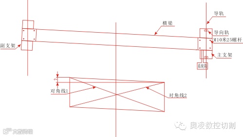 2、数控切割机机械简结构图(1),对角线1大于对角线2的长度。(以主支架的位置为准)因此可知横梁倾斜方向为“↑”。若对角线1小于对角线2的长度。则横梁倾斜方向为“↓”。