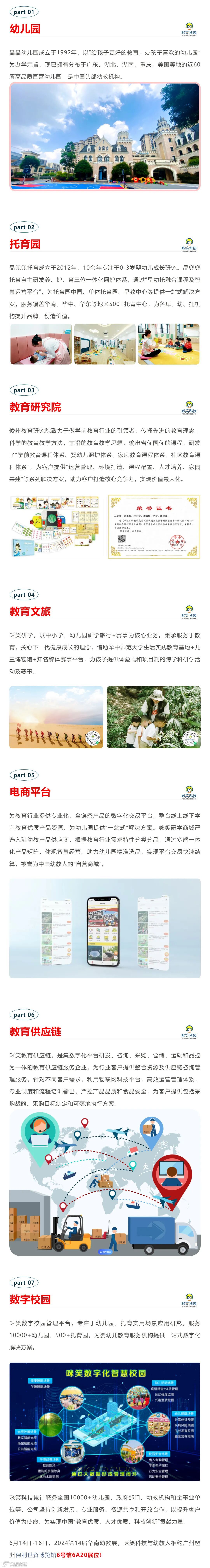 咪笑儿童教育科技有限公司服务的开展依托于晶晶集团32年的办学经验与成果,始终坚持“内容为王、渠道为先、服务为上、文化为魂”的经营理念,以“ 用更好的自己,成就最好的你”的宗旨践行学前教育服务、研学服务的开展,致力于为孩子们、幼教同行等提供高品质的服务。