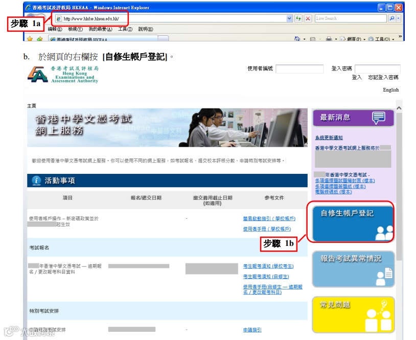 ① 登入网址:www.hkdse.hkeaa.edu.hk,然后点击【自修生账户登记】