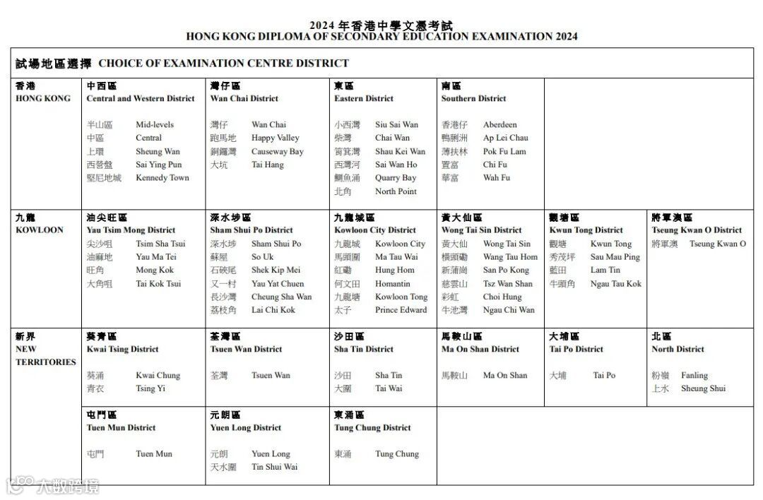 最后关于考场选择!2024年DSE考试场地有以下地区可选: