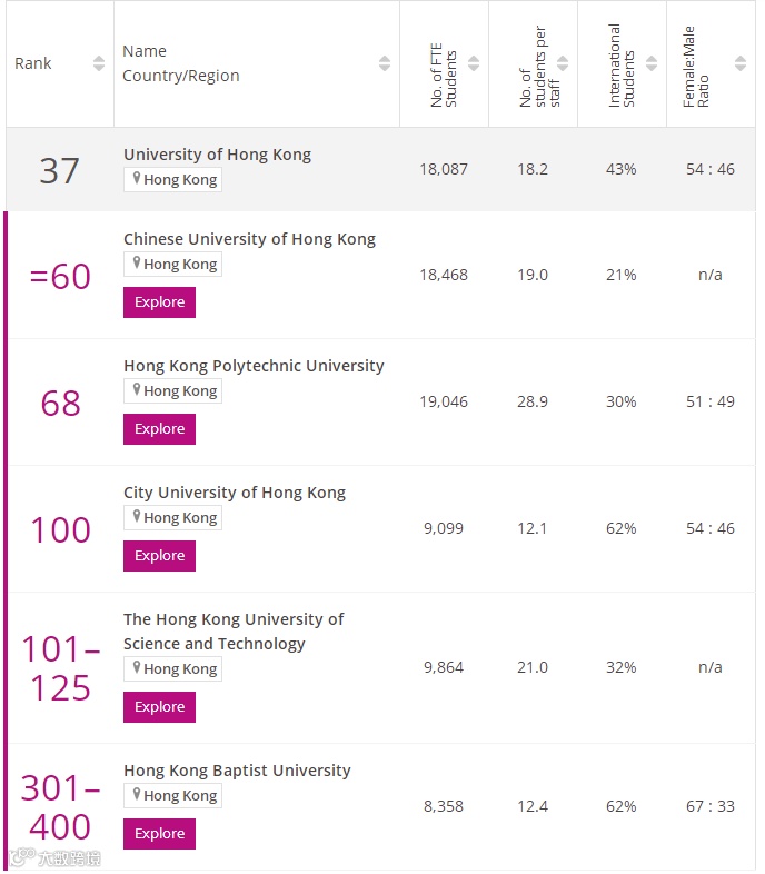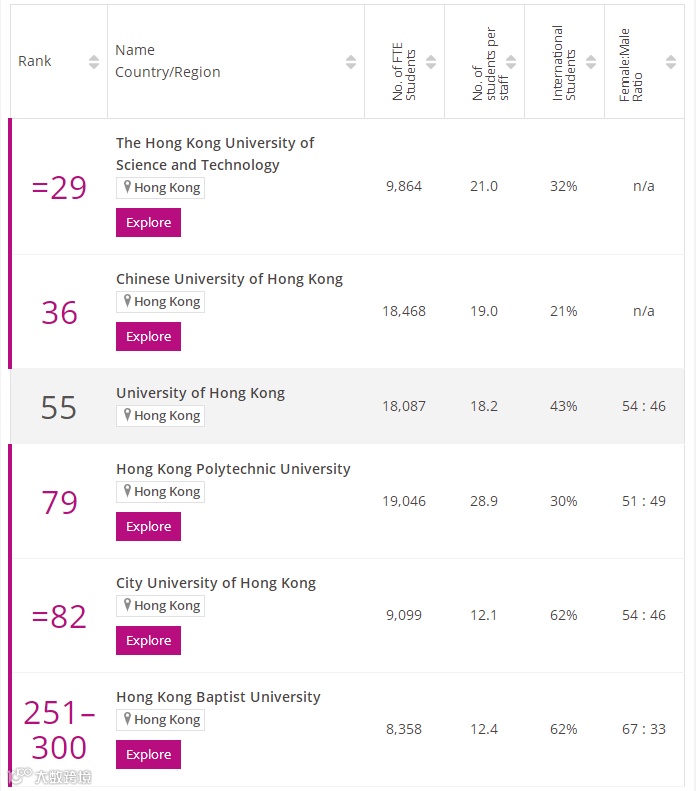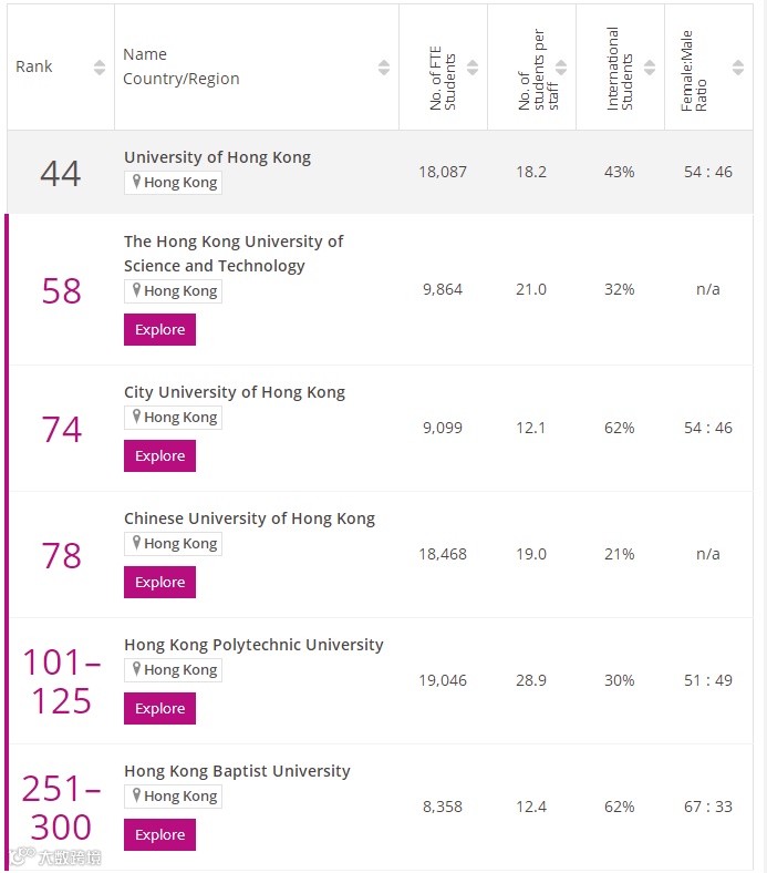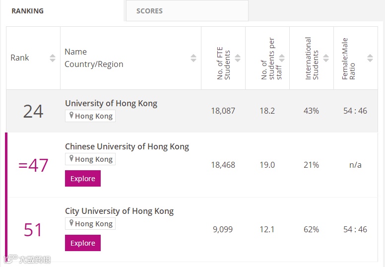 城大顺利冲进世界前100;科大则稍稍差了一点,排在101-125。香港浸会大学则落在了第301-400的位置。