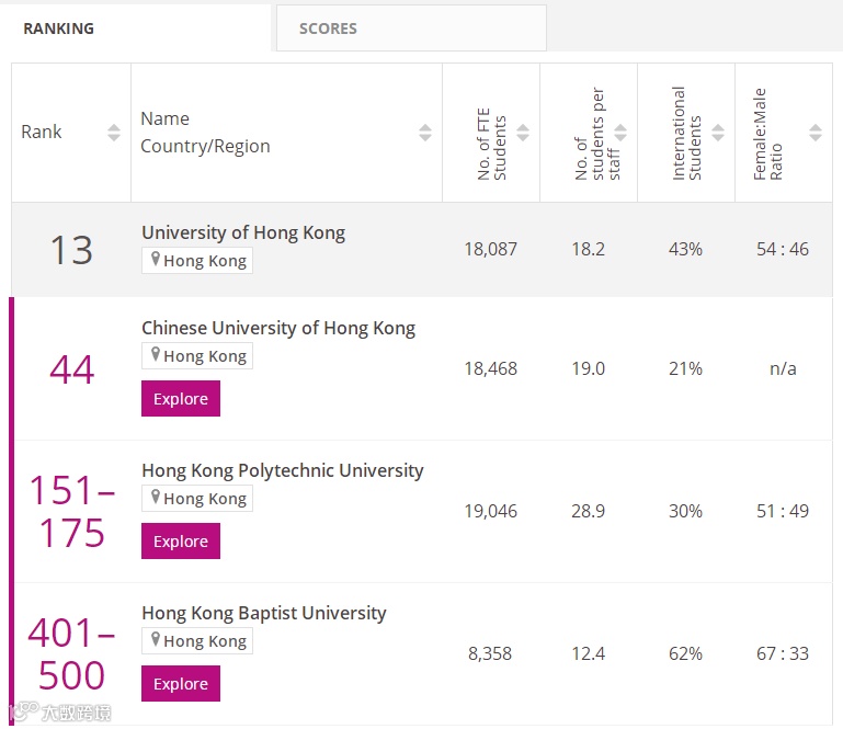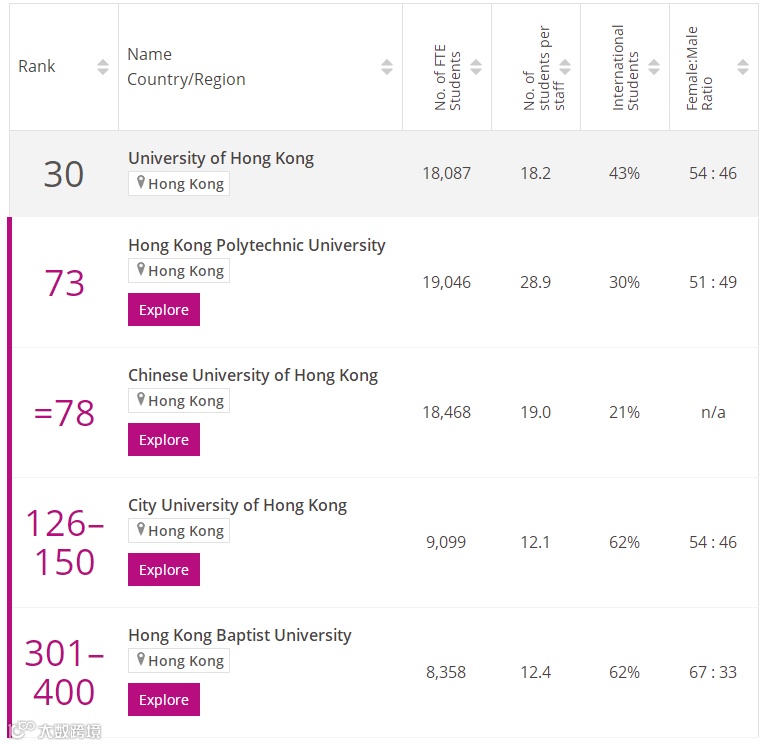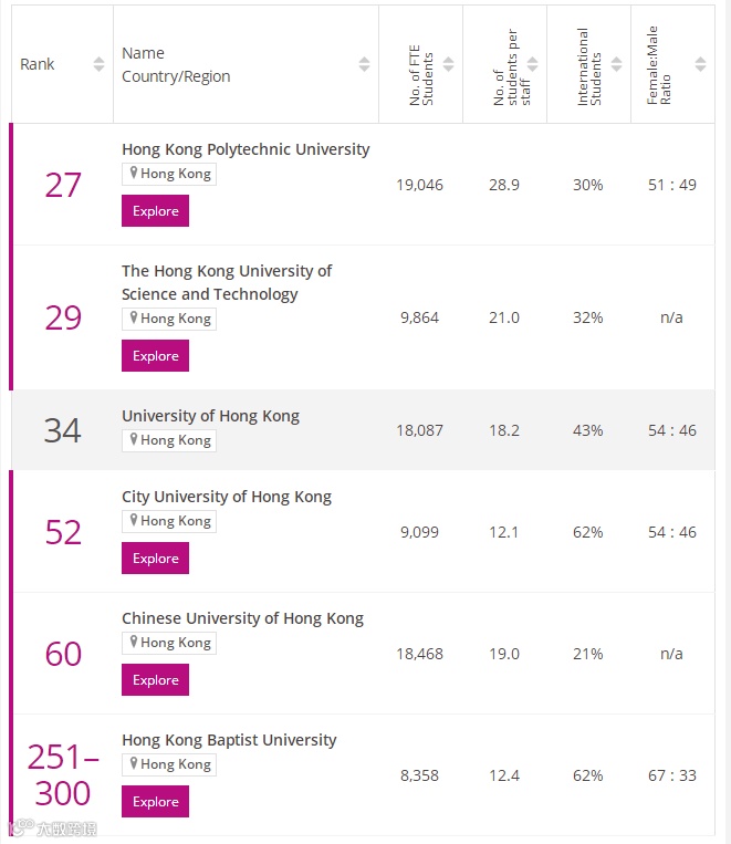 港大排名基本与去年持平(第34);城大进步神速,上升近40名,排在第52名;中大和浸会则略有下滑。