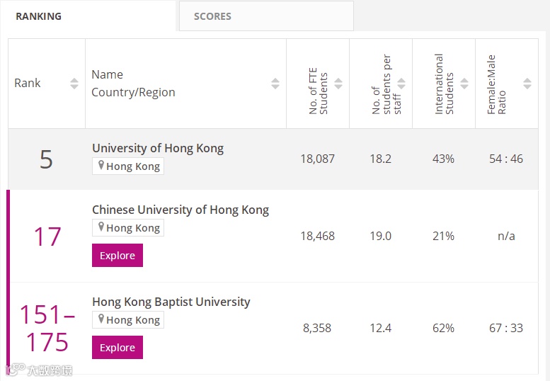 理大和城大相差不大,分别排在第79和82名。浸会的名次则降至251-300。