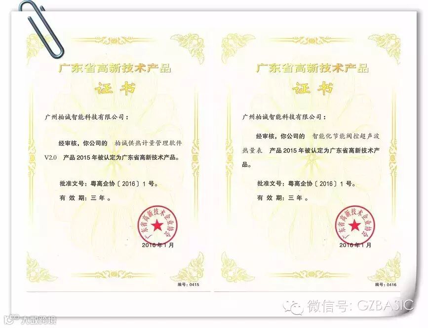 近日,我公司“柏诚供热计量管理软件V2.0”和“智能化节能阀控超声波热量表”申报2015年度高新技术产品通过省科协技术厅、省高新技术企业协会等相关部门认定,获得了广东省高新技术产品证书。此次认定,对柏诚智能的科研成果与科技创新能力的又一次权威认可。