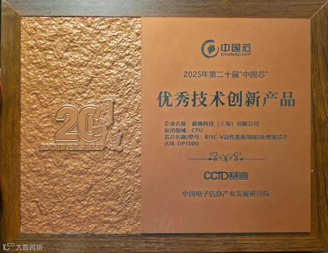 近日,备受行业瞩目的2025年“中国芯”集成电路产业促进大会暨第二十届“中国芯”优秀产品征集结果发布仪式圆满落幕。超睿科技凭借自主研发的UR-DP1000 RISC-V高性能通用处理器芯片,从303家参赛企业,410款申报产品中脱颖而出,成功斩获2025年第二十届“中国芯”【优秀技术创新产品】奖。