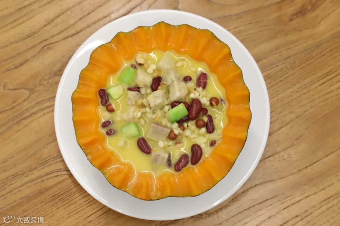 4.煮水1000g调入仟味金汤2号2汤匙一起煮开后分别加入备好的燕麦仁、薏仁、茨实、红腰豆、香芋丁、丝瓜丁一起大火煮3-4分钟后用少许水淀粉勾芡出锅浇入蒸熟的南瓜盅里即可出餐(南瓜肉最后可用汤匙挖下拌汤汁同食)。