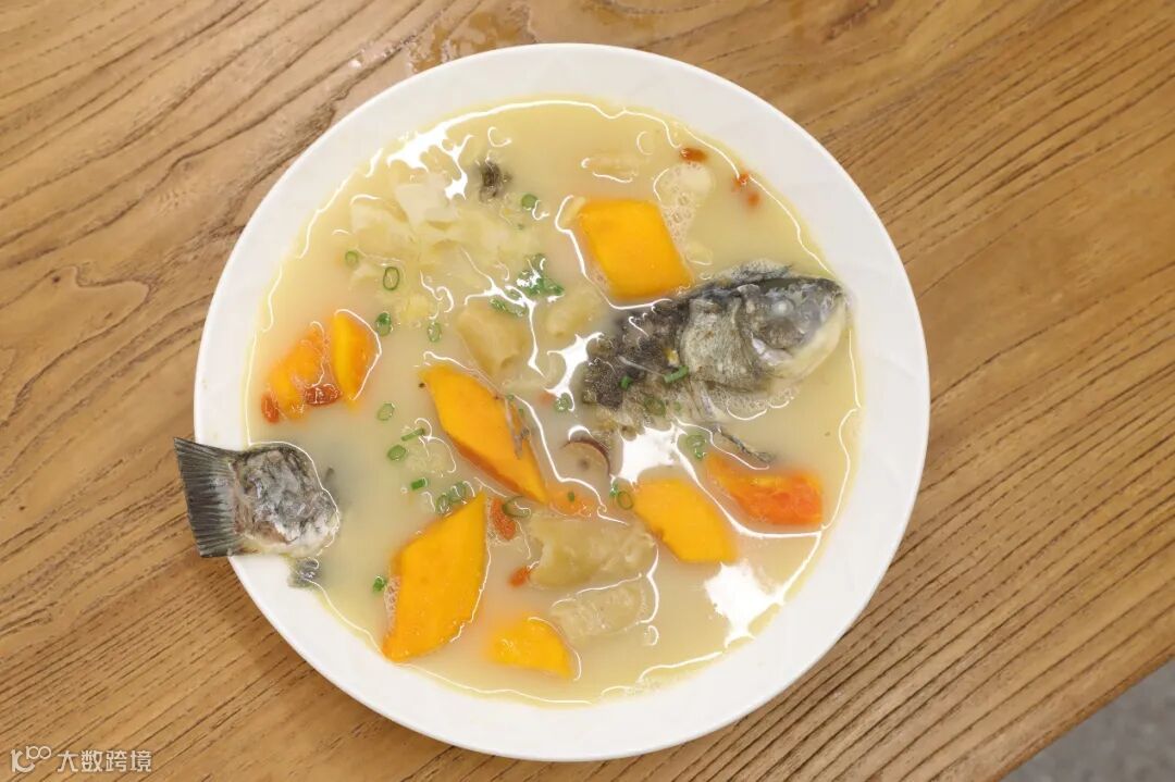 3.另热锅加入少许食用油放入备好的鲫鱼两边煎香后加入姜片炒香,再加入水1000g煮开后调仟味浓汤3汤匙煮均匀后加入准备好木瓜块,花胶段、银耳、红枣、枸杞子一起大火煮4-5分钟后出锅,倒入汤碗里即可食用。